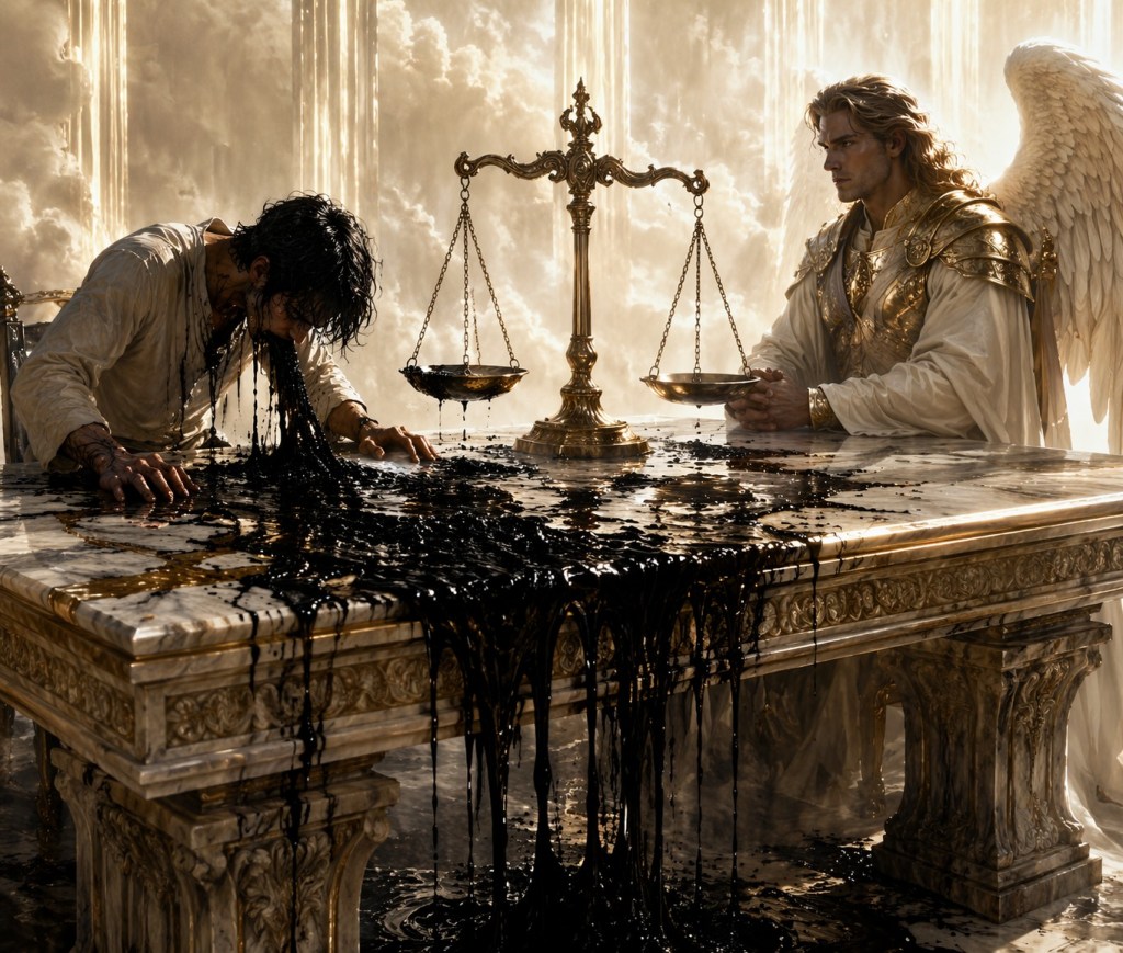 The chamber was not built. It simply was. No walls. No ceiling. No end. Only light—endless, quiet light—and in the center of it, a table of stone that seemed older than memory itself. Upon it rested a scale. Ryan sat on one side. Across from him sat the archangel. Archangel Michael did not blink. He did not breathe. He simply was—as immovable as truth, as patient as eternity. And Ryan—Ryan was unraveling.